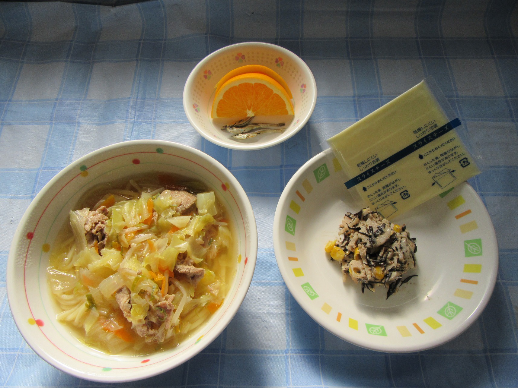 【昼食】ラーメン・れんこんサラダ・チーズ・オレンジ・いりこ