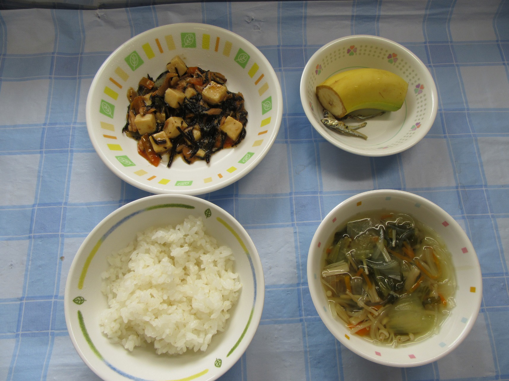 【昼食】ごはん・炒り豆腐・春雨スープ・バナナ・いりこ