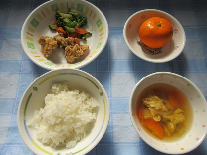 2026年01月29日(木) 給食ブログ NEW 2026.1.29 【昼食】ごはん・鶏のから揚げ・ブロッコリーのおかか和え・かきたま汁・みかん・いりこ 【おやつ】お茶(未満児は牛乳)・フルーツきんとん