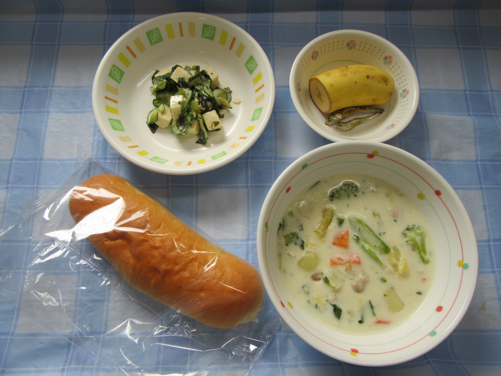 【昼食】パン・花野菜のシチュー・豆腐サラダ・バナナ・いりこ