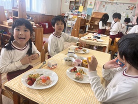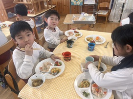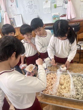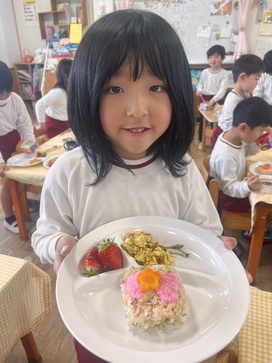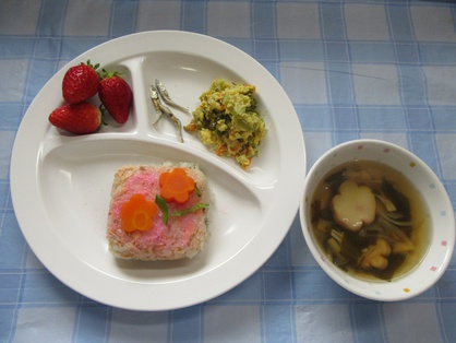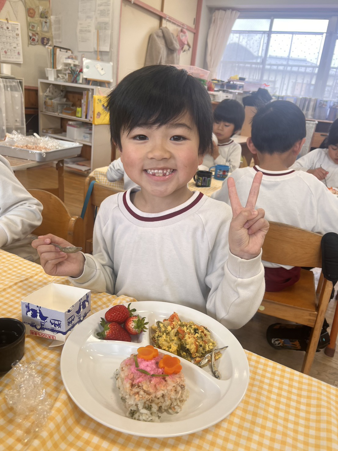 2026年03月14日(土) 給食ブログ 2026.3.3 ひな祭り給食 【昼食】ちらし寿司・はなっこりーのマヨ卵炒め・花麩のお汁・いちご・いりこ 【おやつ】カルピス・ひな祭りクッキー 牛乳パックで型を作り、押し寿司作りに挑戦!鮭・ごま・のりの3色のごはんを順番に詰め、桜でんぶと花型にんじんで飾り付けします! 「きれいにできたよ!」 「かわいいお顔にしたよ!」 「(型を)お家に持って帰ってもう1回作りたい!」 子どもたちからの要望を聞き、卵炒めにマヨネーズを追加して改良…「これならいける!!」合格をいただきました☆彡