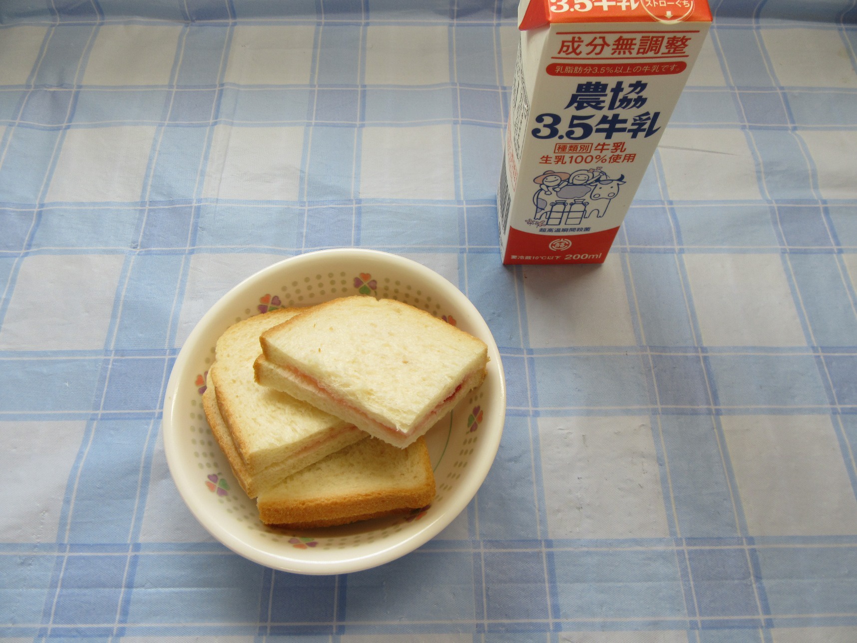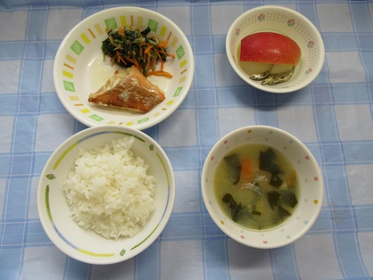 2026年03月04日(水) 給食ブログ 2026.3.4 【昼食】ごはん・赤魚の煮付け・ごまず和え・豆腐のお味噌汁・りんご・いりこ 【おやつ】牛乳・セレクトサンドイッチ(ブルーベリージャム・いちごジャム)