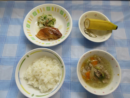 【昼食】ごはん・赤魚の煮付け・きゅうりとツナの酢の物・豚汁・バナナ・いりこ