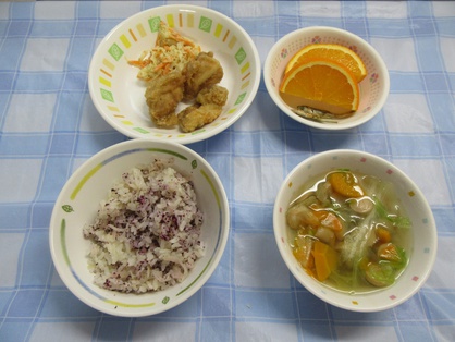 【昼食】ハリハリゆかりごはん・鶏のから揚げ・ゆでキャベツ・レタスのスープ・オレンジ・いりこ