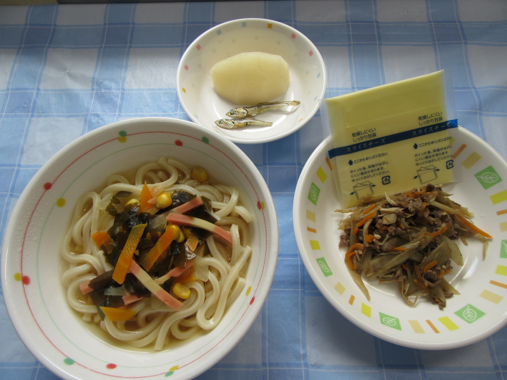 【昼食】わかめうどん・牛肉とごぼうの煮物・チーズ・梨・いりこ