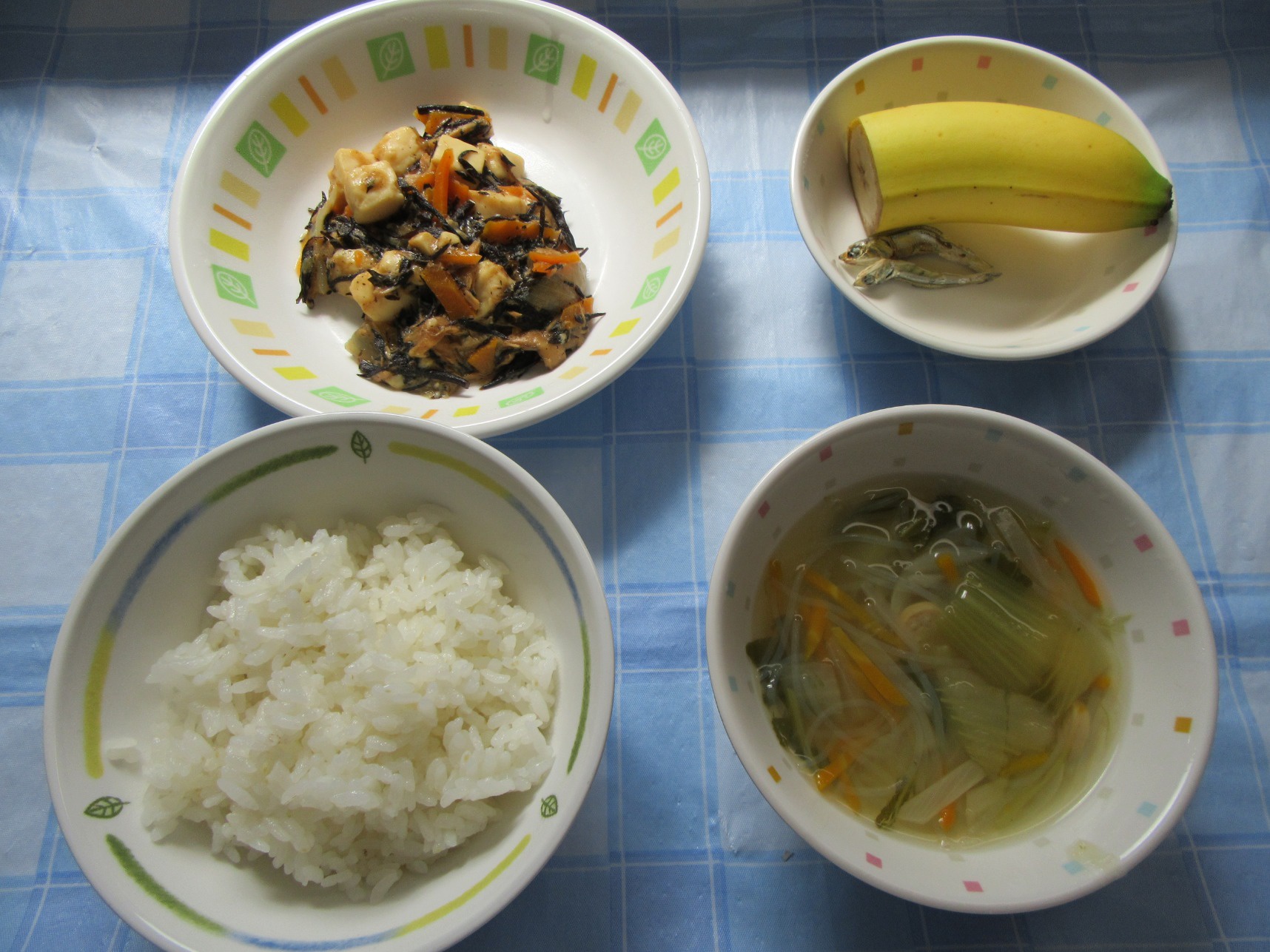 【昼食】ごはん・炒り豆腐・春雨スープ・バナナ・いりこ