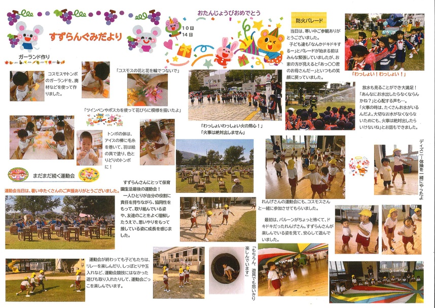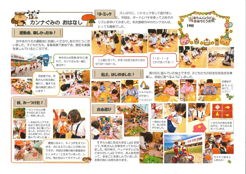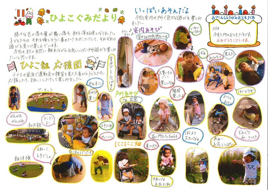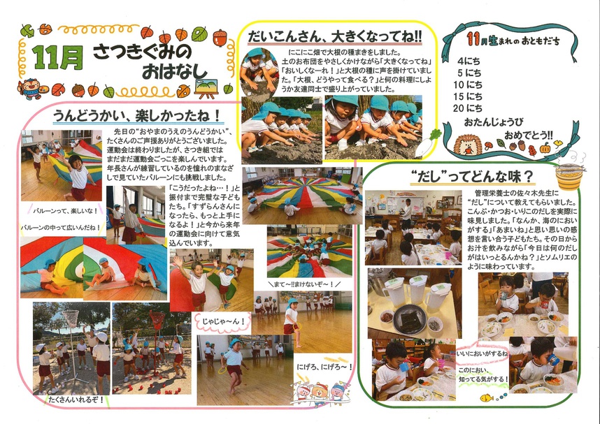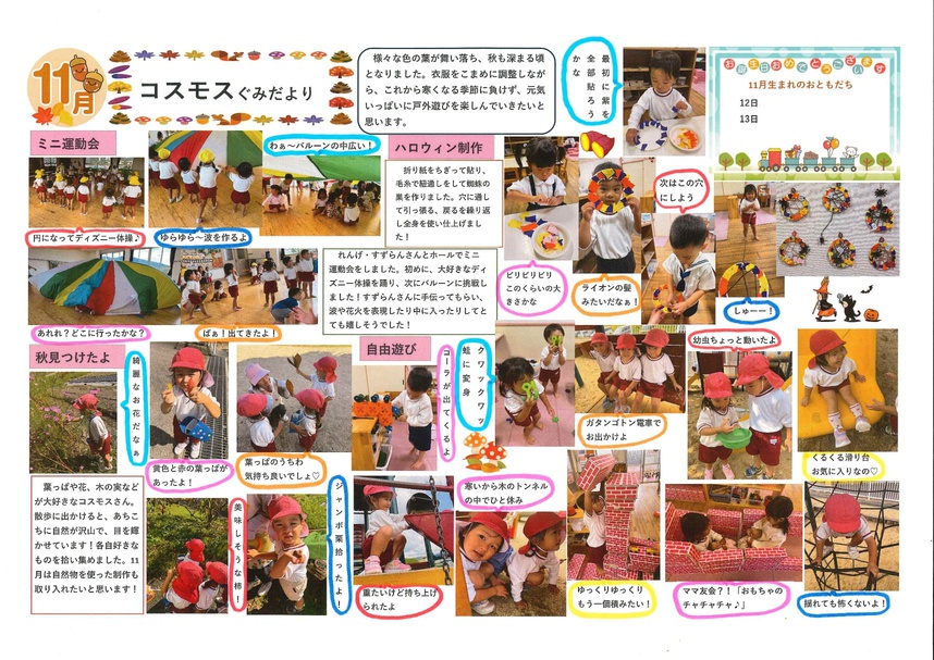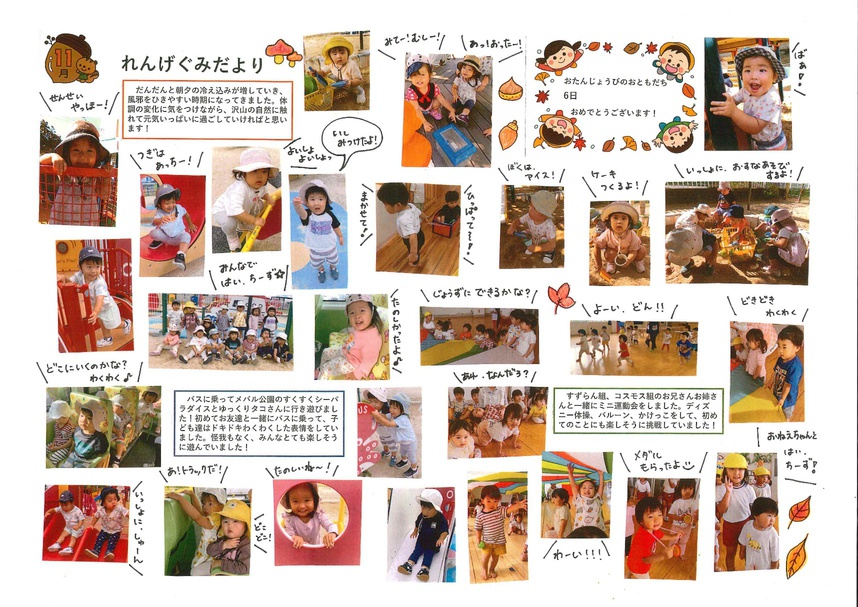 2025年10月31日(金) お知らせ NEW 令和7年度 11月号クラスだより ひよこ組 11月号 れんげ組 11月号 コスモス組 11月号 カンナ組 11月号 さつき組 11月号 すずらん組 11月号