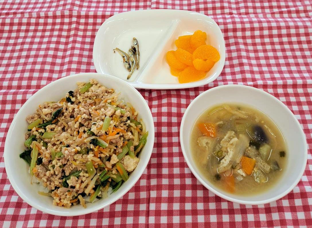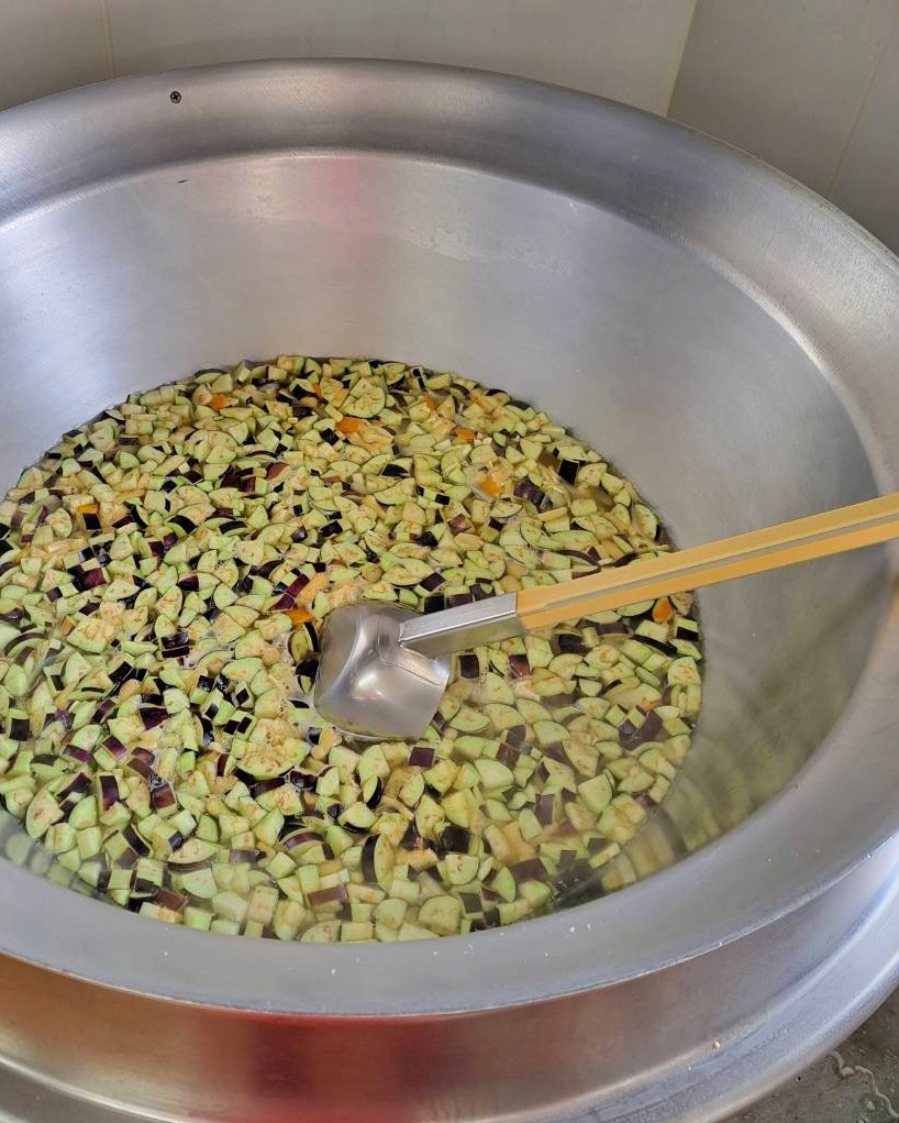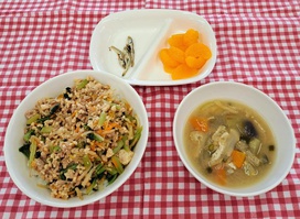 今日のみそ汁は、年中さんが観察園から採ってきてくれた茄子を使いました。茄子の他には油揚げ、玉ねぎ、人参、葱が入っています。