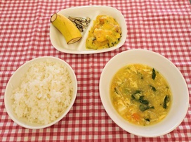 2025年09月30日(火) 幼稚園給食 かぼちゃ豆乳グラタン ・白ごはん ・かぼちゃ豆乳グラタン ・中華風コーンスープ ・バナナ ・いりこ 給食のグラタンは、牛乳ではなく豆乳で作ります。豆乳をみそと塩で味付けし、米粉でとろみをつけたグラタンソースです。いつも食べているグラタンとは少し違うと思いますが、子どもたちにとても人気があります。もっと食べたかった…と言っている子もいました。