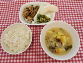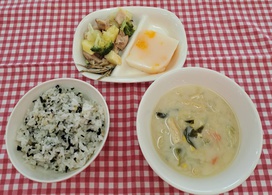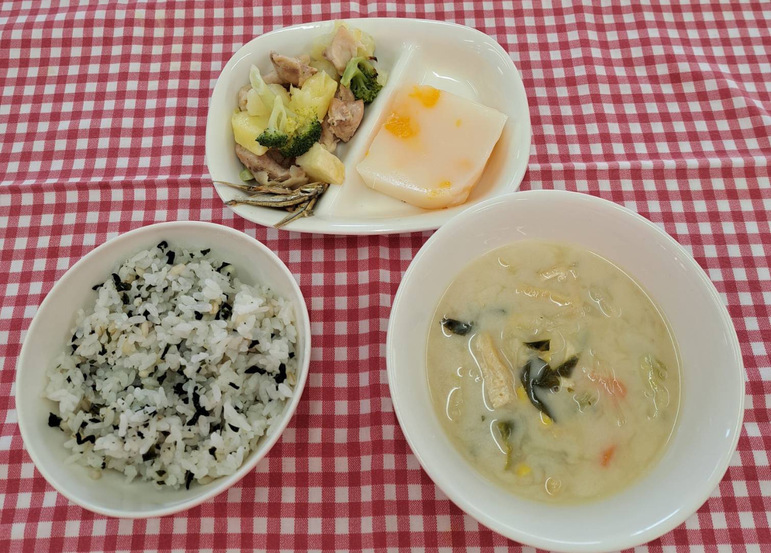 2025年10月02日(木) 幼稚園給食 ポテトと鶏肉のオーブン焼き ・わかめごはん(麦) ・ポテトと鶏肉のオーブン焼き ・豆乳みそ汁 ・手作りカルピスゼリー ・いりこ オーブン焼きには、じゃがいも、鶏肉、ブロッコリーを使用し、味付けは塩こしょうのみ。シンプルな料理ですが、よく食べていました。野菜嫌いな子もブロッコリーなら食べられるようです。