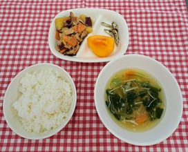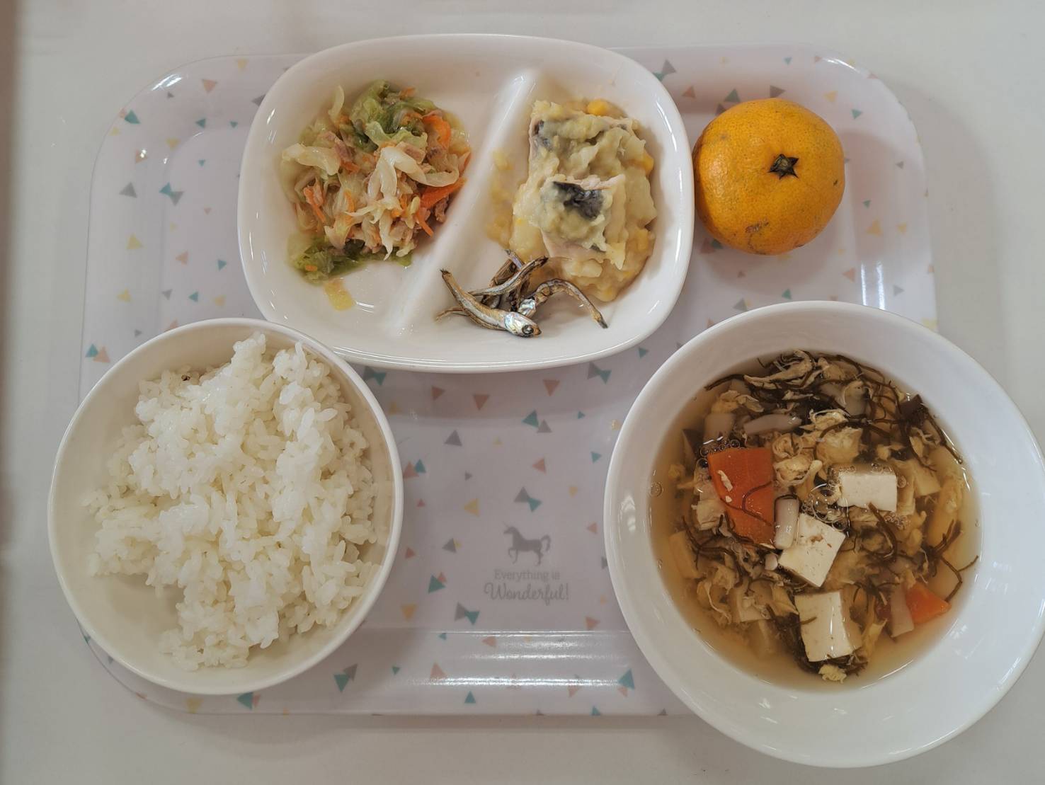 2025年11月07日(金) 幼稚園給食 NEW みかん ・白ごはん ・さわらのポテト焼き ・キャベツとツナの甘酢和え ・もずく入りかき玉汁 ・みかん ・いりこ 今シーズン初のみかんでした。年少さんも皮を自分でむいて食べることができました。美味しかったですね。 きれいなオレンジ色をした甘いみかんでした。