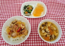 2025年10月27日(月) 幼稚園給食 鶏の照り焼き丼 ・鶏の照り焼き丼(麦ごはん) ・チンゲン菜のとろみ炒め ・もずく入りかき玉汁 ・手作りフルーツ寒天 ・いりこ 鶏の照り焼き丼には、赤と黄色のパプリカが入っていて彩りもきれい。子どもたちも喜んで食べているようです。