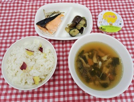 2025年10月03日(金) 幼稚園給食 お月見給食 ・さつまいもごはん ・さけの塩焼き ・揚げ茄子 ・鶏ときのこのすまし汁 ・お月見デザート ・いりこ 今年は10月6日が「十五夜」で、少し早いですが給食ではお月見デザートを出しました。その他、さつまいも、さけ、茄子、きのこなど秋を感じる食材を使用した献立にしました。茄子には苦戦した子も多かったようです。 デザートのゼリーは、夜空に浮かぶお月見をイメージしたもので、ブルーベリー味のゼリーのなかに、丸いかたちのみかんゼリーが入っています。