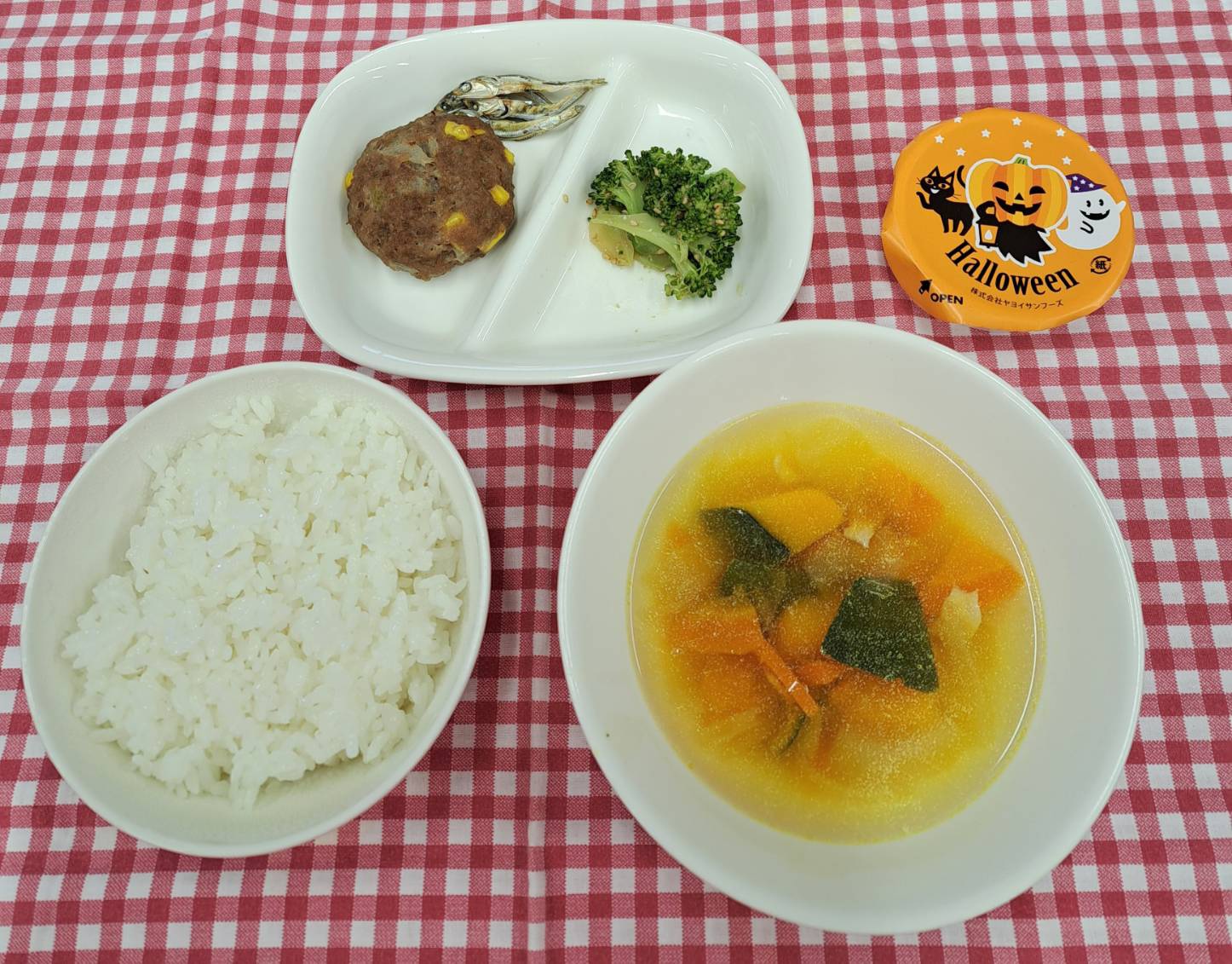2025年10月31日(金) 幼稚園給食 コーンハンバーグ ・白ごはん ・コーンハンバーグ ・ブロッコリーのごま和え ・かぼちゃのスープ ・ハロウィンデザート ・いりこ ハンバーグはもちろん手作りです。きざんだ玉ねぎとコーン、つなぎには片栗粉を使っています。卵やパン粉などは入っていないのでアレルギーのある子も同じものが食べられます。
