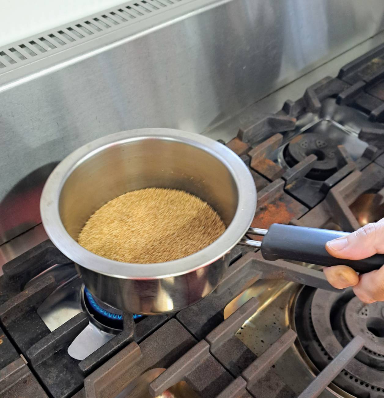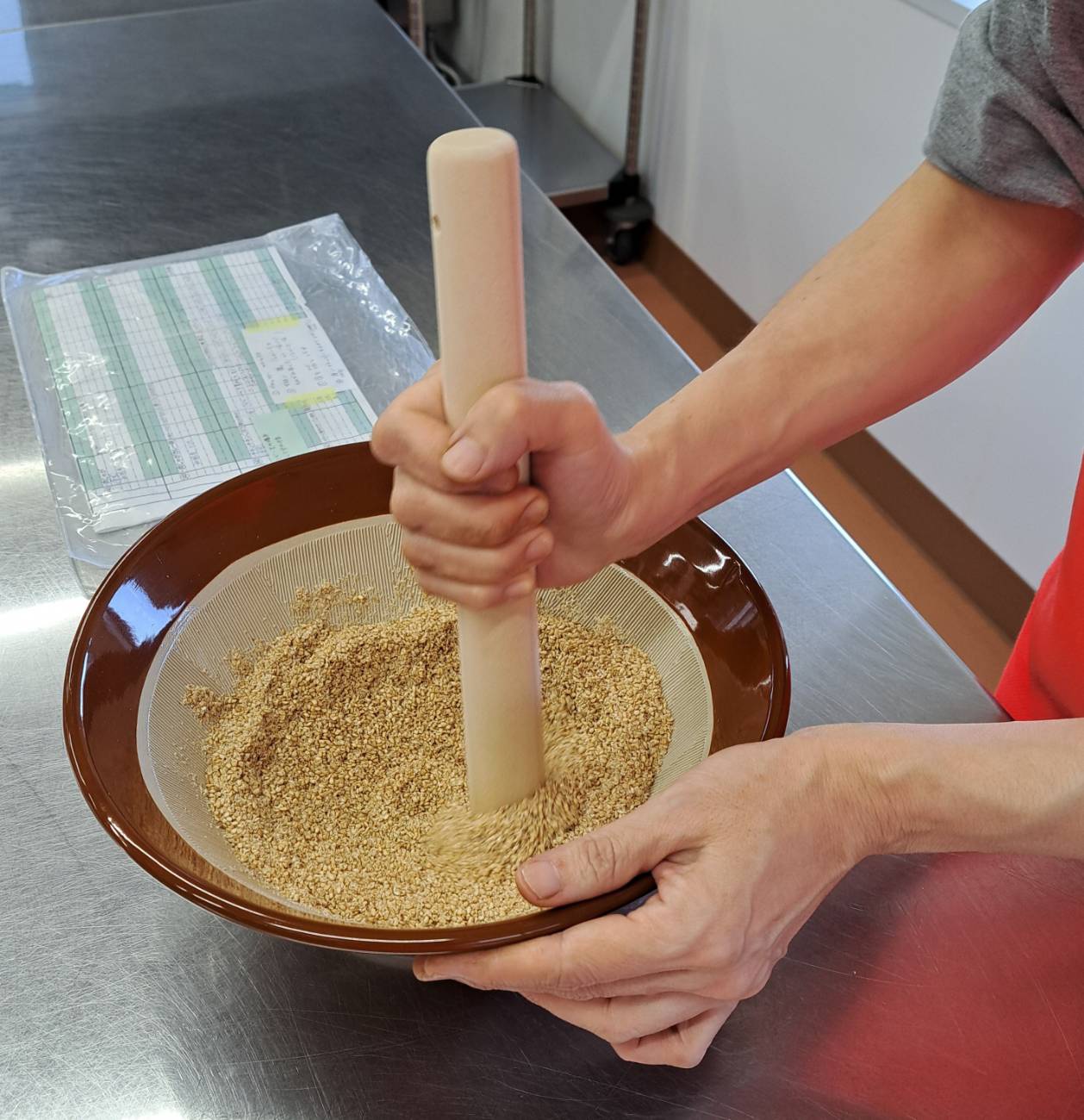 2025年10月09日(木) 幼稚園給食 きゅうりのごま和え ・白ごはん ・チキンチキンごぼう ・きゅうりのごま和え ・みそ汁 ・梨 ・いりこ ごま和えのごまは、いりごまを使用していますが、和える直前に鍋で煎って風味をよくしています。とてもよい香りがします。 煎ったごまは、すり鉢ですります。ごま和えのときは粒が半分ほど残るくらいにしています。ごまをするとさらに香りが強くなります。
