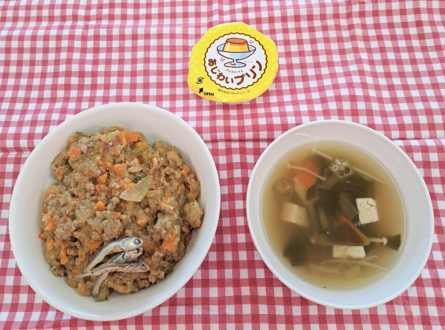 2025年10月08日(水) 幼稚園給食 ドライカレー ・ドライカレー(麦ごはん) ・すまし汁 ・プリン(乳卵不使用) ・いりこ 大人気のドライカレー。前日から楽しみにしている子もいるようです。 ドライカレーの野菜は玉ねぎ、人参、ピーマン、カットトマト缶で、お肉は豚ひき肉を使用しています。