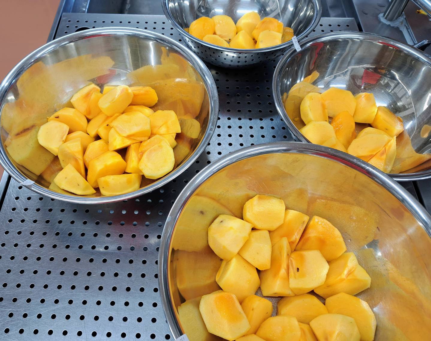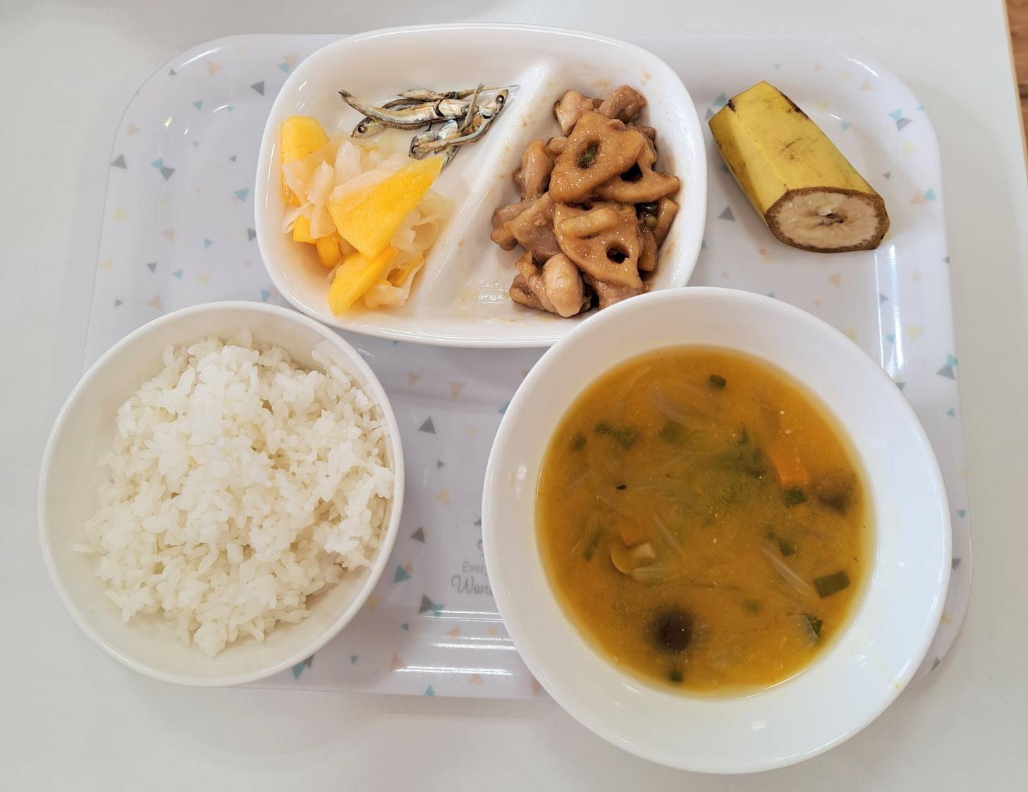 2025年11月06日(木) 幼稚園給食 NEW 柿なます ・白ごはん ・チキンチキンれんこん ・柿なます ・みそ汁 ・バナナ ・いりこ 柿なますは、大根と柿で作りました。柿のオレンジ色がきれいで彩りがよかったです。大根が苦手な子もいましたが、柿と一緒に食べたら美味しかった…と言っている子もいました。
