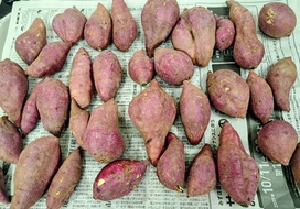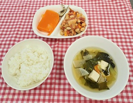2025年11月19日(水) 幼稚園給食 鶏肉と大豆の揚げ煮 ・白ごはん ・鶏肉と大豆の揚げ煮 ・むらくも汁 ・りんご ・いりこ さつまいもの黄色、人参のオレンジ色、ほうれん草の緑色…と彩りのよいおかずです。鶏肉、大豆も入っています。
