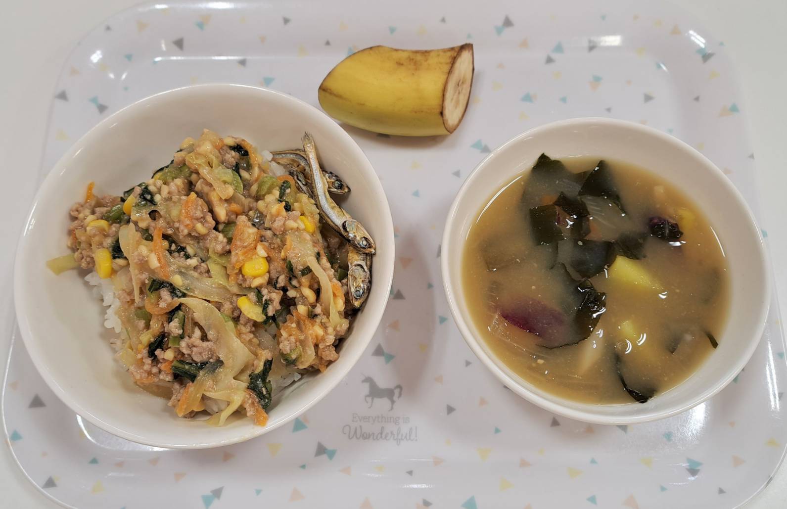 2025年11月27日(木) 幼稚園給食 NEW さつまいものみそ汁 ・納豆そぼろ丼(麦ごはん) ・みそ汁(いりこだし) ・バナナ ・いりこ 今日のみそ汁は、園で採れたさつまいもを入れて作りました。お汁にもさつまいもの甘い味が溶け込んでいて、美味しいみそ汁ができました。