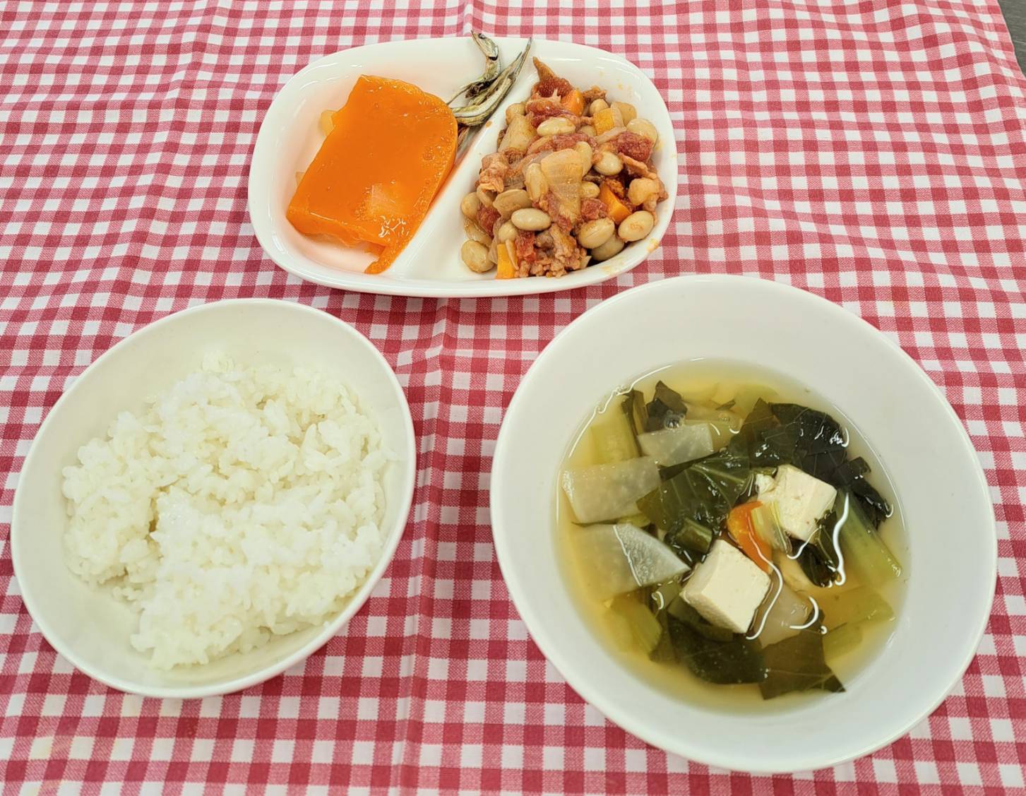 2025年11月25日(火) 幼稚園給食 NEW 手作りキャロットゼリー ・白ごはん ・ポークビーンズ ・すまし汁(かつお昆布だし) ・手作りキャロットゼリー ・いりこ キャロットゼリーは、人参ジュースとりんごジュースを混ぜて、寒天で固めて作りました。ゼリーの色は人参の色をしていますが、見た目ほど人参の味はしません。中に角切りのりんごのシラップ漬けも入っています。