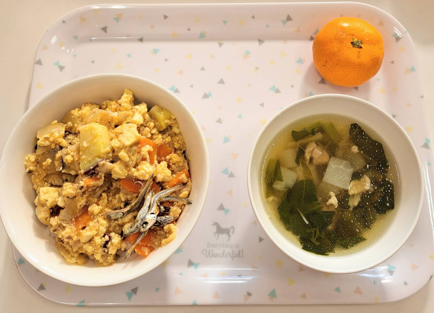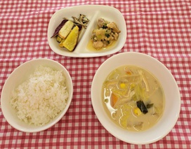 2025年12月16日(火) 幼稚園給食 豆乳みそ汁 ・白ごはん ・鶏の焼きおろし煮 ・豆乳みそ汁 ・さつまいもスティック ・いりこ 豆乳みそ汁は子どもたちに人気のお汁で、冬は白菜など冬の野菜が入ります。いつものお味噌汁の最後に少し豆乳を加えて作ります。
