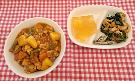 2025年12月09日(火) 幼稚園給食 カレー ・カレー(麦ごはん) ・ほうれん草とちくわのごま和え ・手作りりんごゼリー ・いりこ 今日は、みんなが大好きなカレーの日です。朝から楽しみにしている子もいるようです。カレーはおかわりできるように、少し多めに作っています。たくさん食べられたかな?