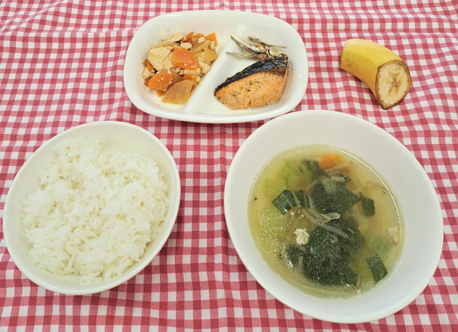 2025年12月12日(金) 幼稚園給食 けんちょう ・白ごはん ・さけのみそ焼き ・けんちょう ・中華風スープ ・バナナ ・いりこ 今日は山口県の郷土料理、けんちょうでした。給食のけんちょうは、木綿豆腐、大根、人参で作ります。地域や家庭によっては他に油揚げや椎茸、こんにゃく、鶏肉などが入ることもあるようです。 大根にもしっかり味がしみていて、美味しいけんちょうができました。 子どもたちもよく食べていました。