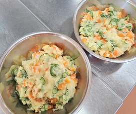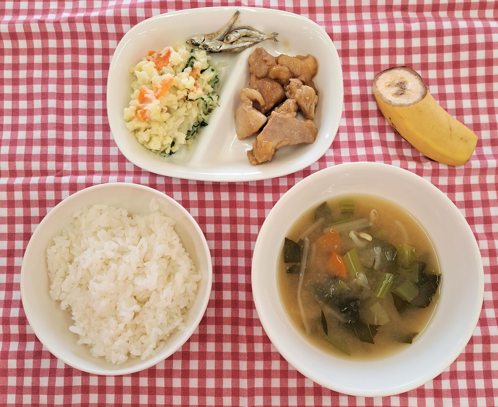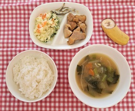 2026年01月13日(火) 幼稚園給食 NEW さっぱりポテトサラダ ・白ごはん ・鶏肉のやわらか照りつけ ・さっぱりポテトサラダ ・みそ汁 ・バナナ ・いりこ さっぱりポテトサラダには、おからが入っていて食物繊維たっぷりです。マヨネーズを使わずに米油、酢、きび砂糖で作ったドレッシングで和えました。 おからはオーブンで焼きました。