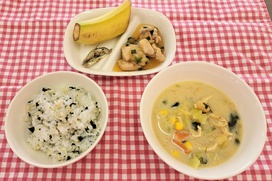 2026年01月27日(火) 幼稚園給食 NEW 豆乳みそ汁 ・白ごはん ・鶏の焼きおろし煮 ・豆乳みそ汁 ・バナナ ・いりこ みんなが大好きな豆乳みそ汁。油揚げ、キャベツ、小松菜、人参、コーン、じゃがいも…と、とっても具だくさんです。普通のみそ汁を作り、最後に豆乳を入れ、かき混ぜながら温めて完成です。