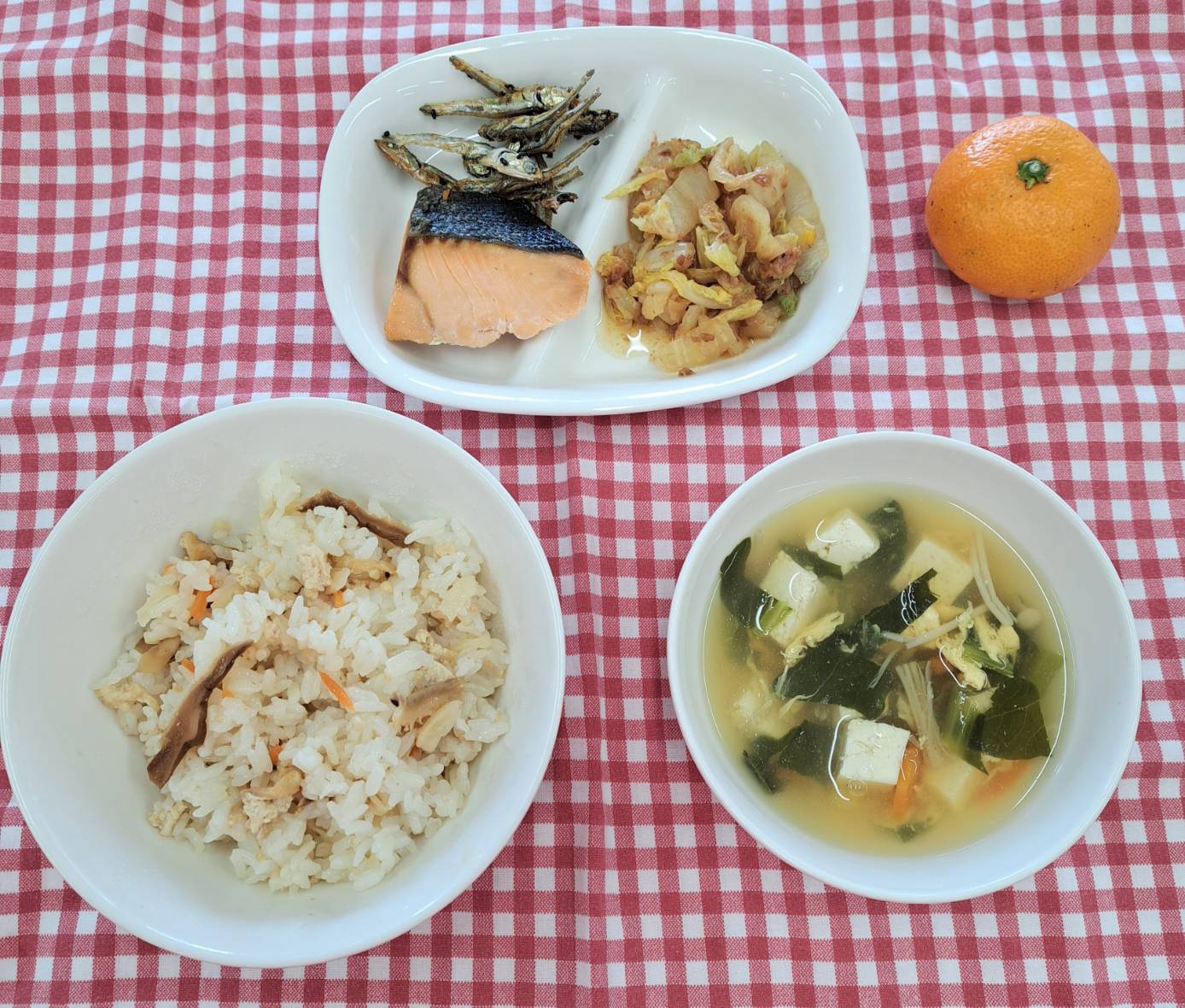 2026年01月09日(金) 幼稚園給食 切り干し大根の混ぜ寿司 ・切り干し大根の混ぜ寿司 ・さけの塩焼き ・白菜のゆず風味 ・かき玉汁 ・田作り ・みかん 明けましておめでとうございます。 今年もよろしくお願いします。 2026年最初の給食は、切り干し大根の混ぜ寿司です。お寿司の具には、切り干し大根、乾椎茸、人参、油揚げ、鶏ひき肉を使用しました。これらをかつお、乾椎茸の出汁と調味料で煮て、酢飯に混ぜて作りました。休み明けの給食なので、食べてもらえるか心配していましたが、とても喜んで食べていたようで安心しました。