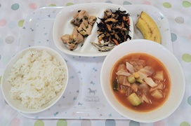 2025年09月18日(木) 幼稚園給食 ミネストローネ ・白ごはん ・鶏肉の甘辛焼き ・ひじきと人参の煮物 ・ミネストローネ ・バナナ ・いりこ ミネストローネには、じゃがいも、ズッキーニ、キャベツ、玉ねぎ、人参、トマト缶と数種類のお豆が入って栄養たっぷりの具だくさんスープになりました。 お豆の種類は、赤いんげん豆、白いんげん豆、ひよこ豆、いんげん豆の4種類です。