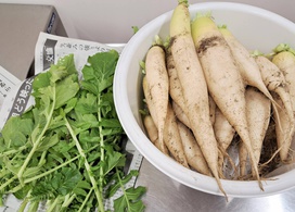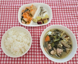 2026年01月16日(金) 幼稚園給食 とりごぼう汁 ・白ごはん ・さけのマリネ ・とりごぼう汁 ・ふかし芋 ・いりこ 今日のとりごぼう汁には、りんご組さんが観察園で収穫してきてくれた大根を入れました。立派な葉っぱも使ったので野菜たっぷりの具だくさん汁になりました。 マリネには、観察園で採れた柚子の果汁を入れました。