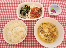 2026年01月30日(金) 幼稚園給食 NEW ほうれん草の豆サラダ ・白ごはん ・さばのトマト煮 ・ほうれん草の豆サラダ ・もずく入りかき玉汁 ・ぶどうゼリー ・いりこ 冬が旬のほうれん草。旬の時期のものは栄養価も高く、甘みもあります。今日のサラダは、ほうれん草と小さく刻んだ水煮大豆を混ぜて作りました。調味料は、砂糖、醤油、酢、油をそれぞれ同量を合わせたものを使用。酢が苦手な子には、合わせた調味料を少し火にかけてあげると酢がまろやかになって食べやすくなります。