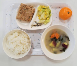 2026年02月10日(火) 幼稚園給食 NEW 納豆バーグ ・白ごはん ・納豆バーグ ・キャベツのコーン煮 ・みそ汁 ・みかん ・いりこ 納豆バーグは、豚ひき肉、ひき割り納豆、白ネギを混ぜてこねたものに、米粉、醤油、塩、こしょうを入れて作ります。オーブンでこんがり焼くので納豆のにおいも少なくなり、食べやすいと思います。子どもたちにも大人気の料理です。 大きい天板で焼いて四角く切って提供しました。