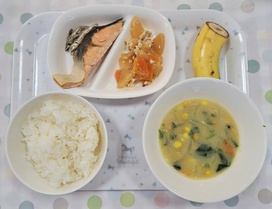 2026年02月27日(金) 幼稚園給食 NEW けんちょう ・白ごはん ・さけの塩焼き ・けんちょう ・豆乳コーンスープ ・バナナ ・いりこ けんちょうは、山口県の郷土料理です。大根、人参も『美味しい!』と言って食べていました。しっかり味もしみていて美味しかったですね。