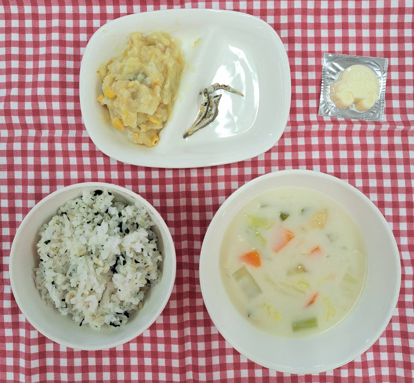 2026年03月10日(火) 幼稚園給食 NEW さわらのポテト焼き ・わかめごはん(麦ごはん) ・さわらのポテト焼き ・豆乳みそ汁(いりこだし) ・型抜きチーズ ・いりこ さわらのポテト焼きも大人気給食メニューです。今日もきれいに完食していました。 『全部おいしかったー!』と言ってもらえました。ありがとう。