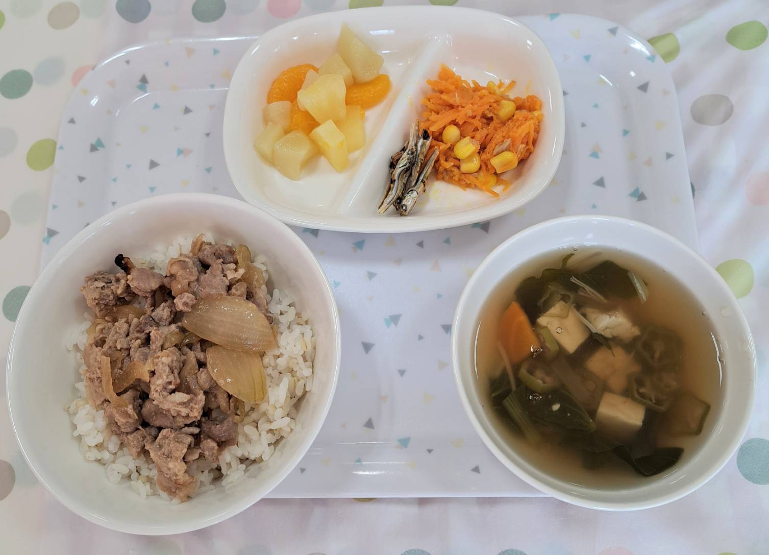 2025年09月24日(水) 幼稚園給食 キャロットサラダ ・焼き肉丼(麦ごはん) ・キャロットサラダ ・すまし汁 ・フルーツ缶 ・いりこ キャロットサラダは、細切りして蒸した人参をツナ、コーンと一緒にドレッシングで和えただけ。ドレッシングは手作りで、酢、米油、砂糖、塩、こしょうを混ぜて作りました。 子どもたちに人気があり、おかわりをして食べてくれた子もいたようです。
