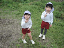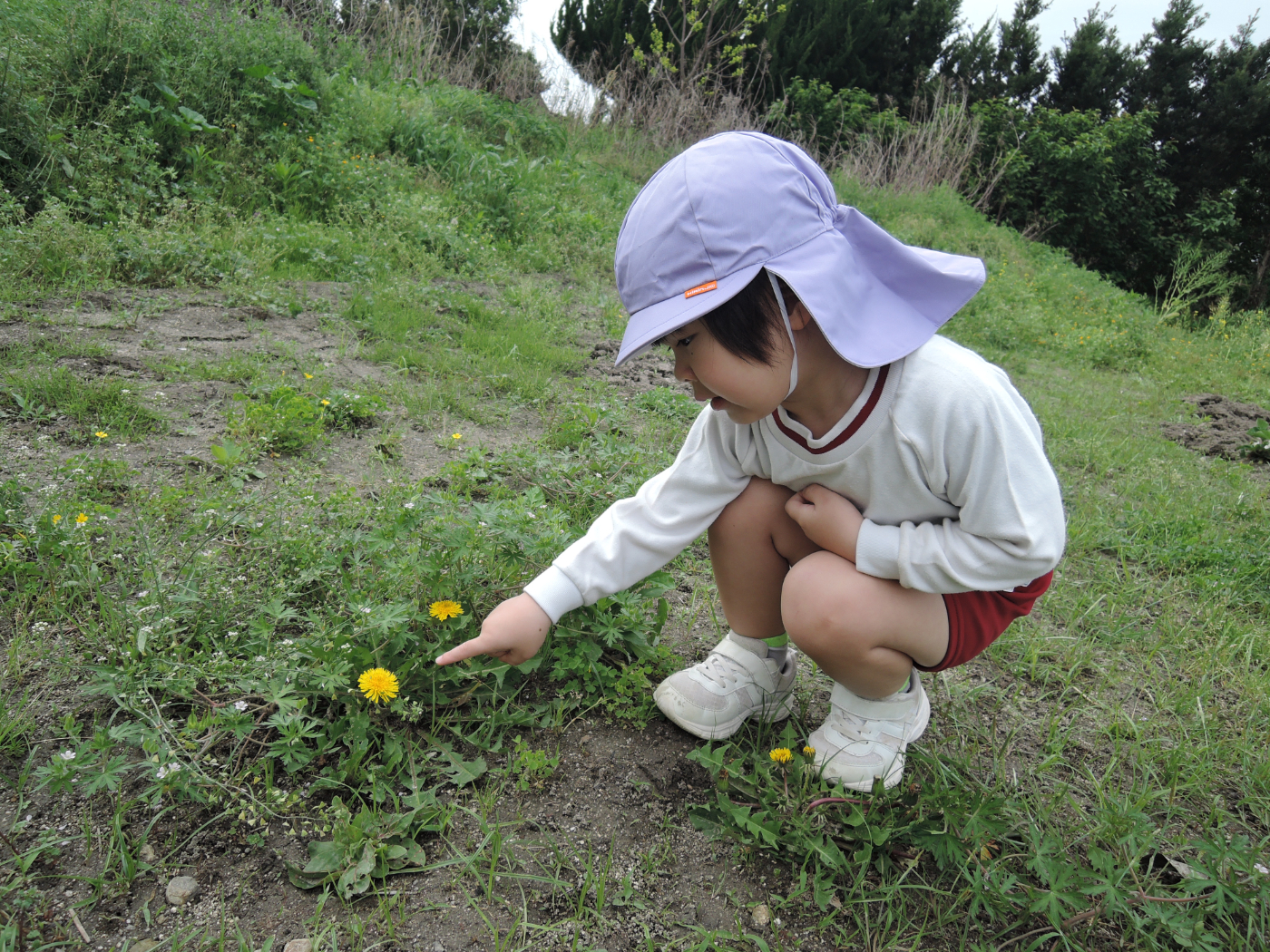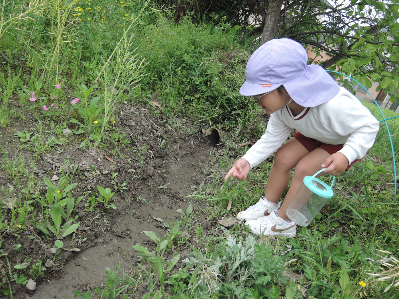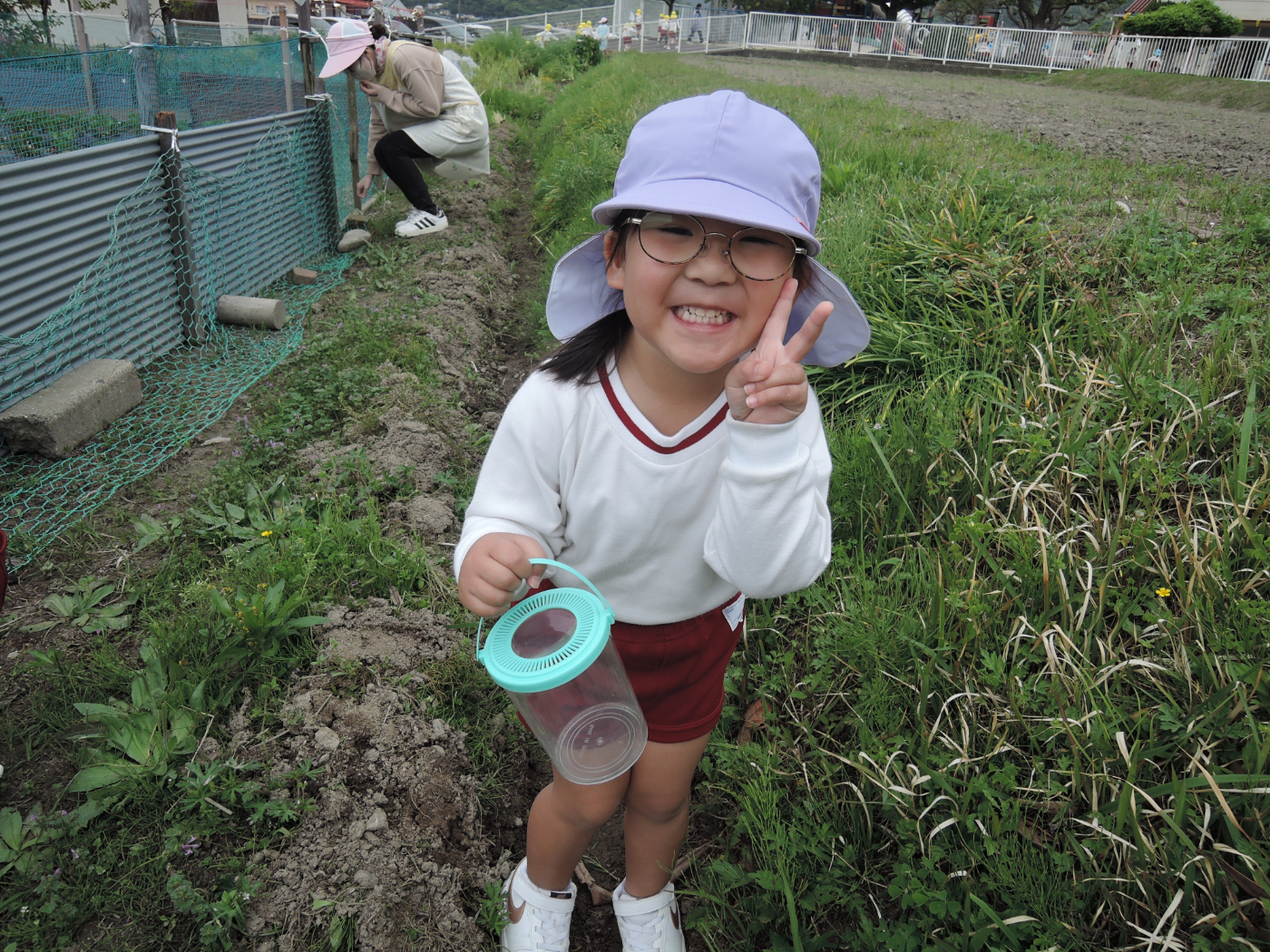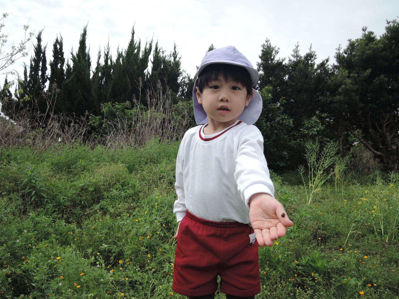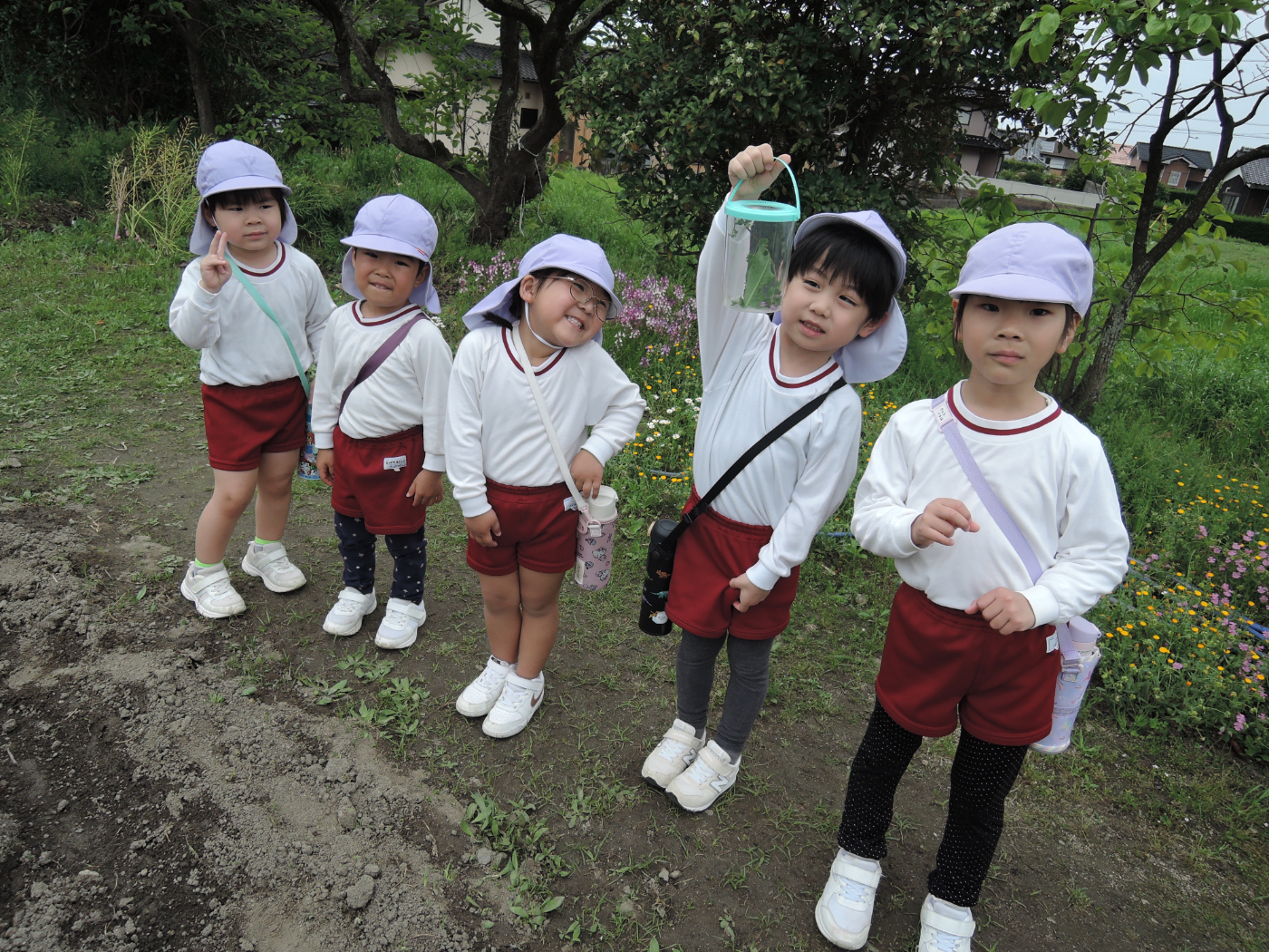 2026年04月21日 虫を見つけよう~あじさい組 朝、あじさい組のお部屋に1ぴきのてんとう虫がやって来ました。ゆり組さんから虫かごを借りて、てんとう虫を熱心に観察しました。1ぴきではさびしいので、にこにこ畑でてんとう虫の友だちを探すことにしました。畑にはたくさんの虫たちが暮らしていて、あじさい組のみんなは大さわぎ。 てんとう虫が手にとまったよ たんぽぽ きれいだね 虫とり たのしい~ かわいい バッタかな? バッタのまねしてみよう ジャンプするよ 綿毛 とばそう あっ! ネコの足あとだ お花 きれいだね 仲間がふえたよ ゆり組さんは つかまえるのが上手 チョウチョが虫かごに入るかな