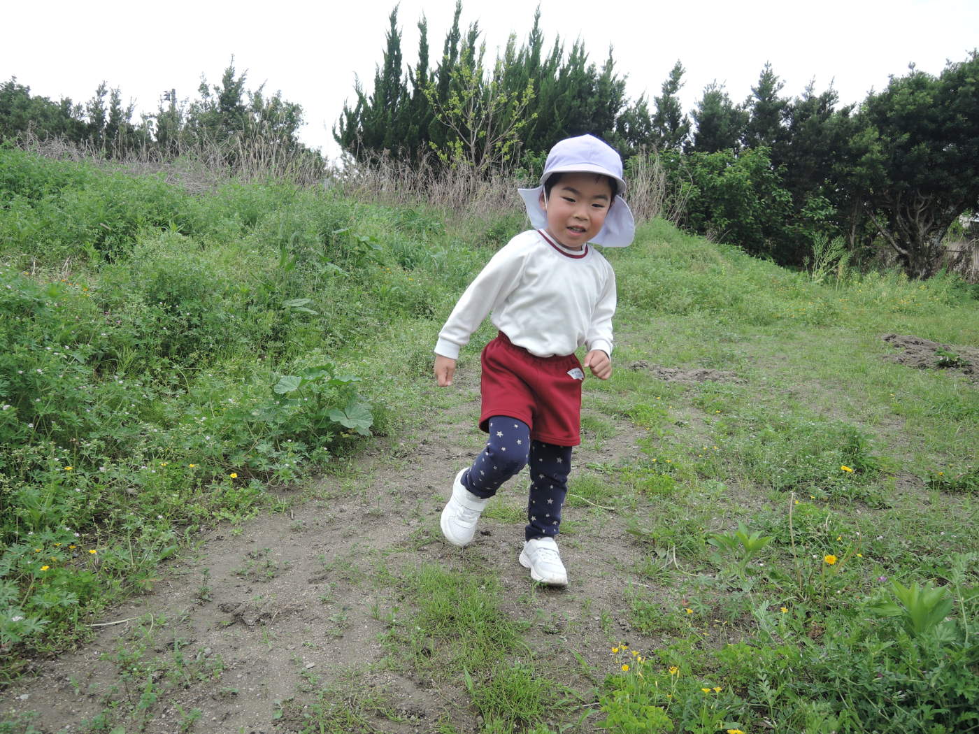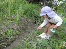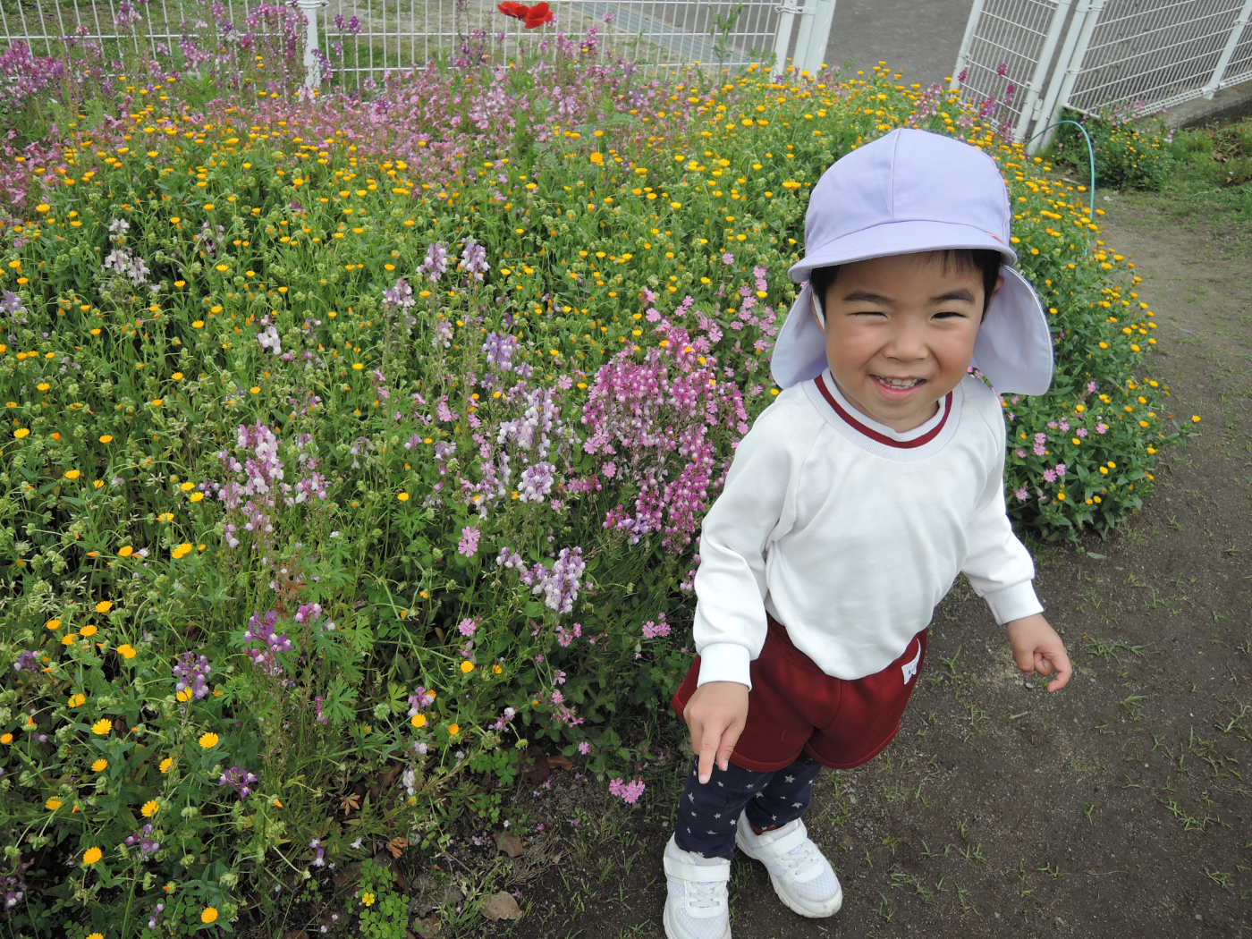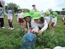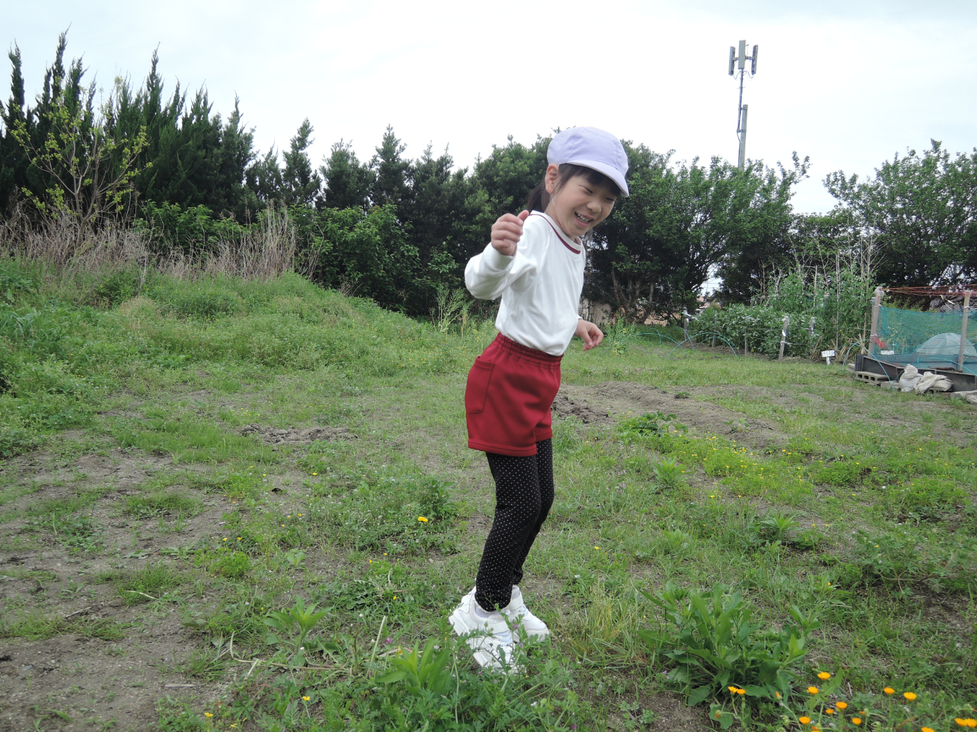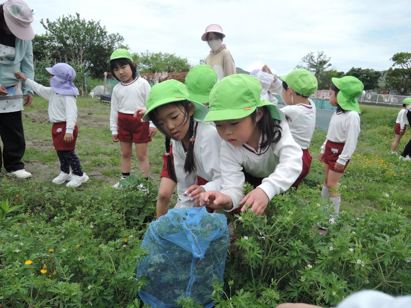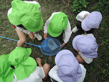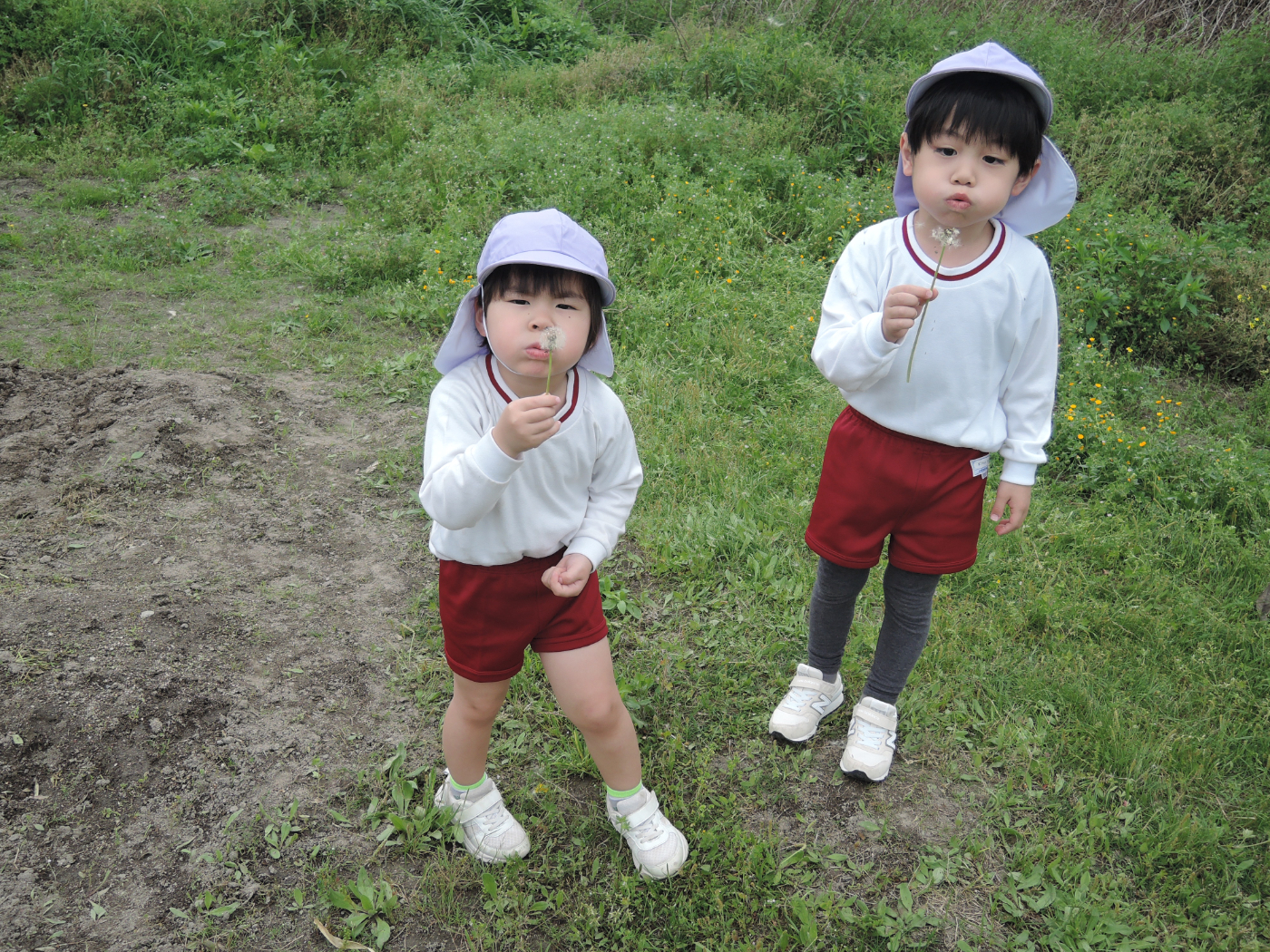 2026年04月21日 虫を見つけよう~あじさい組 朝、あじさい組のお部屋に1ぴきのてんとう虫がやって来ました。ゆり組さんから虫かごを借りて、てんとう虫を熱心に観察しました。1ぴきではさびしいので、にこにこ畑でてんとう虫の友だちを探すことにしました。畑にはたくさんの虫たちが暮らしていて、あじさい組のみんなは大さわぎ。 てんとう虫が手にとまったよ たんぽぽ きれいだね 虫とり たのしい~ かわいい バッタかな? バッタのまねしてみよう ジャンプするよ 綿毛 とばそう あっ! ネコの足あとだ お花 きれいだね 仲間がふえたよ ゆり組さんは つかまえるのが上手 チョウチョが虫かごに入るかな