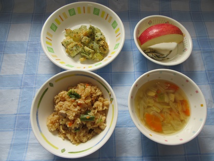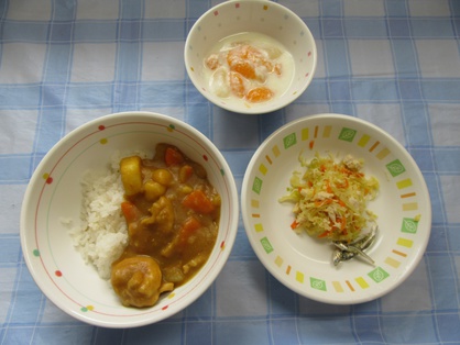 【昼食】カレーライス・鶏ささみのしっとりサラダ・フルーツヨーグルト・いりこ