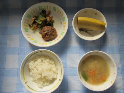 【昼食】ごはん・納豆ボール・小松菜の煮浸し・里芋のお味噌汁・バナナ・いりこ