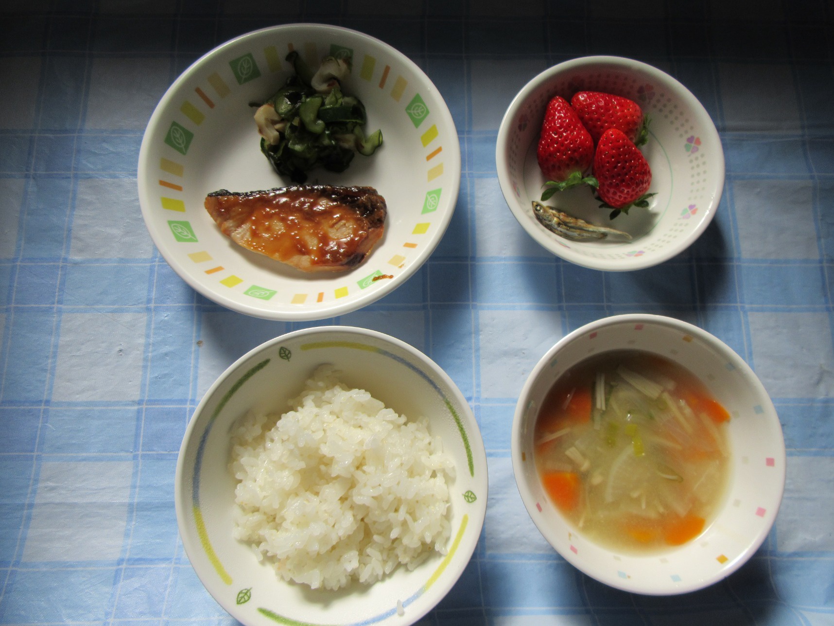 【昼食】ごはん・ぶりの照り焼き・わかめの酢の物・大根のお味噌汁・いちご・いりこ