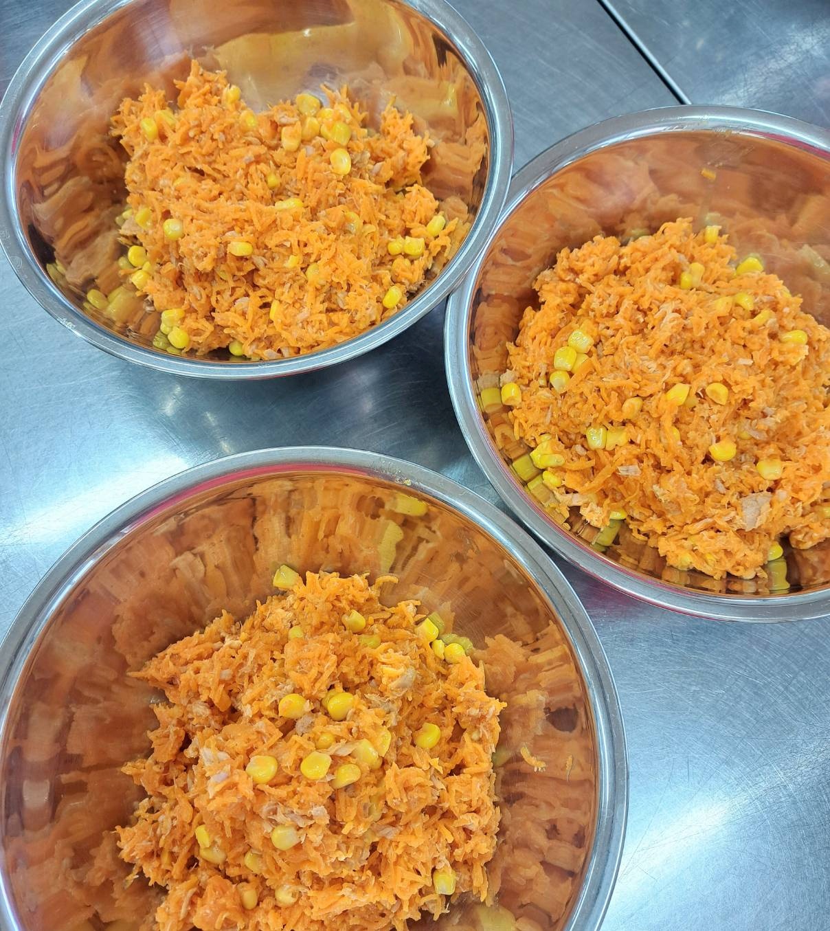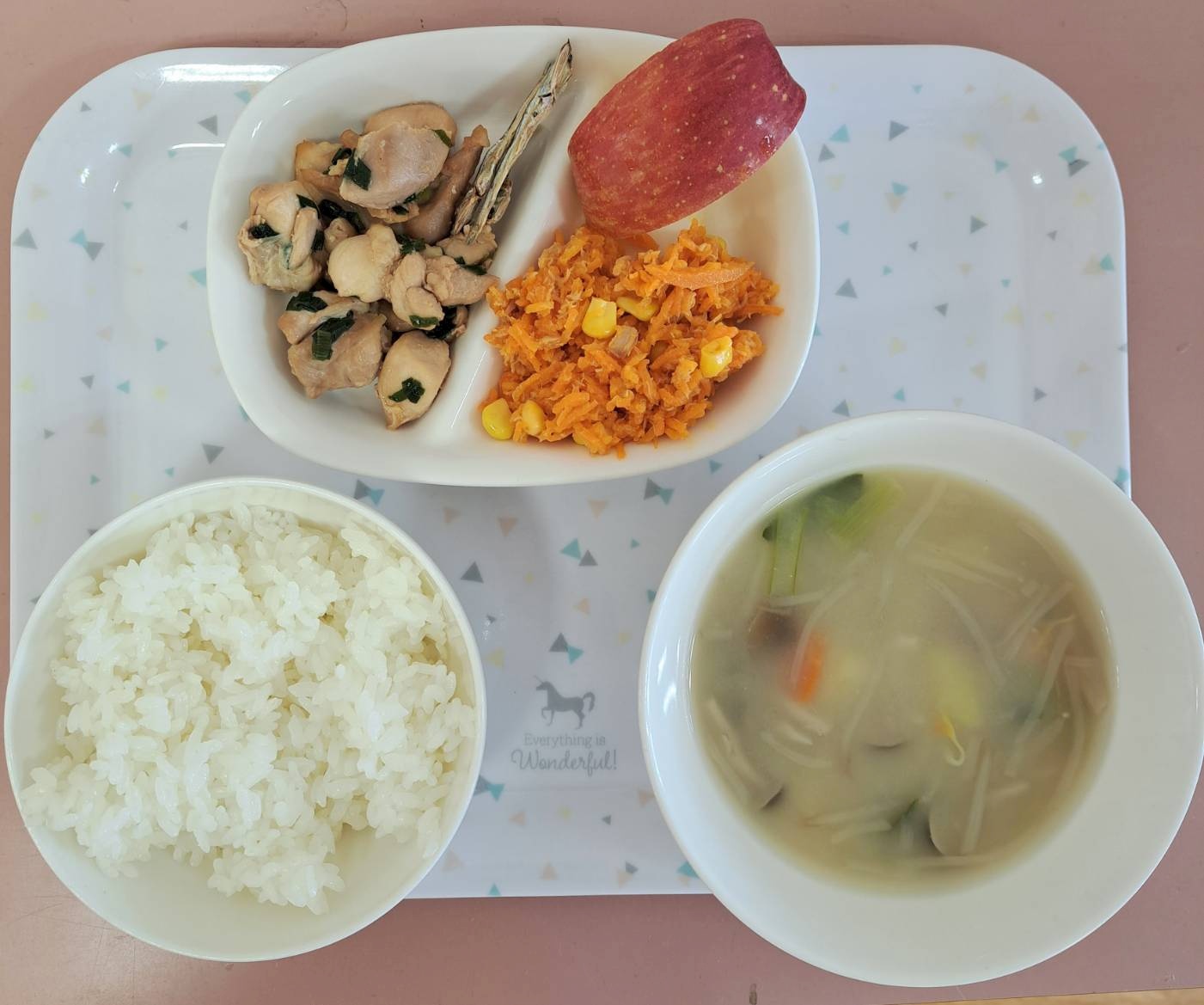 2026年04月28日(火) 幼稚園給食 NEW キャロットサラダ ・白ごはん ・鶏肉の甘辛焼き ・キャロットサラダ ・みそ汁 ・りんご ・いりこ キャロットサラダの人参は、細く千切りして蒸しているので、柔らかくて甘みがありました。ツナやコーンも入っているので食べやすかったようです。『人参おいしい!!』と言ってペロリと食べていました。 きれいなオレンジ色で彩りもよかったです。