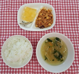 2026年04月21日(火) 幼稚園給食 NEW チリコンカン ・白ごはん ・チリコンカン ・春雨スープ ・手作りりんごゼリー ・いりこ チリコンカンは、豚ひき肉と豆類、玉ねぎをトマト(カットトマト缶使用)で煮込んだ料理です。本来はチリパウダーが入ったスパイシーな料理ですが、子ども用にカレー粉で味付けしました。人気のある料理で、ご飯にかけて食べる子もいるようです。