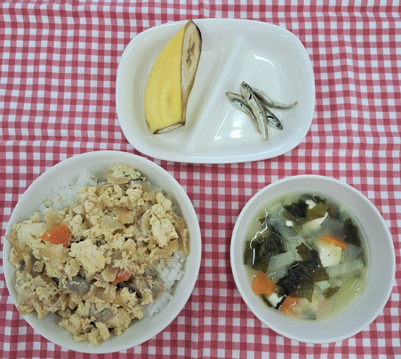 給食の親子丼は、鶏肉、玉ねぎの他、人参やしいたけも入っています。